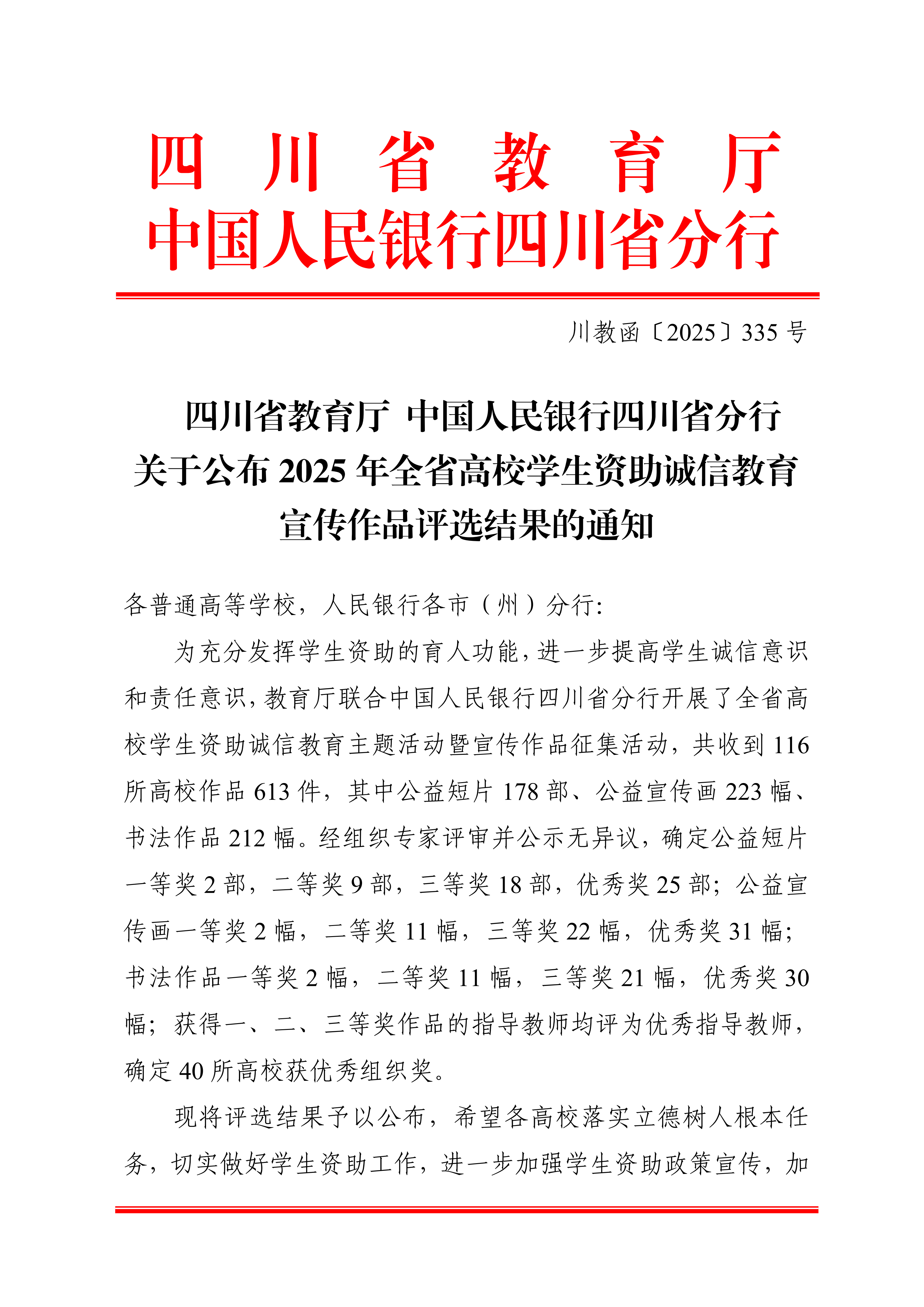 四川省教育厅中国人民银行四川省分行联合印发《关于公布2025年全省高校学生资助诚信教育宣传作品评选结果的通知》(川教函〔2025〕335号)。