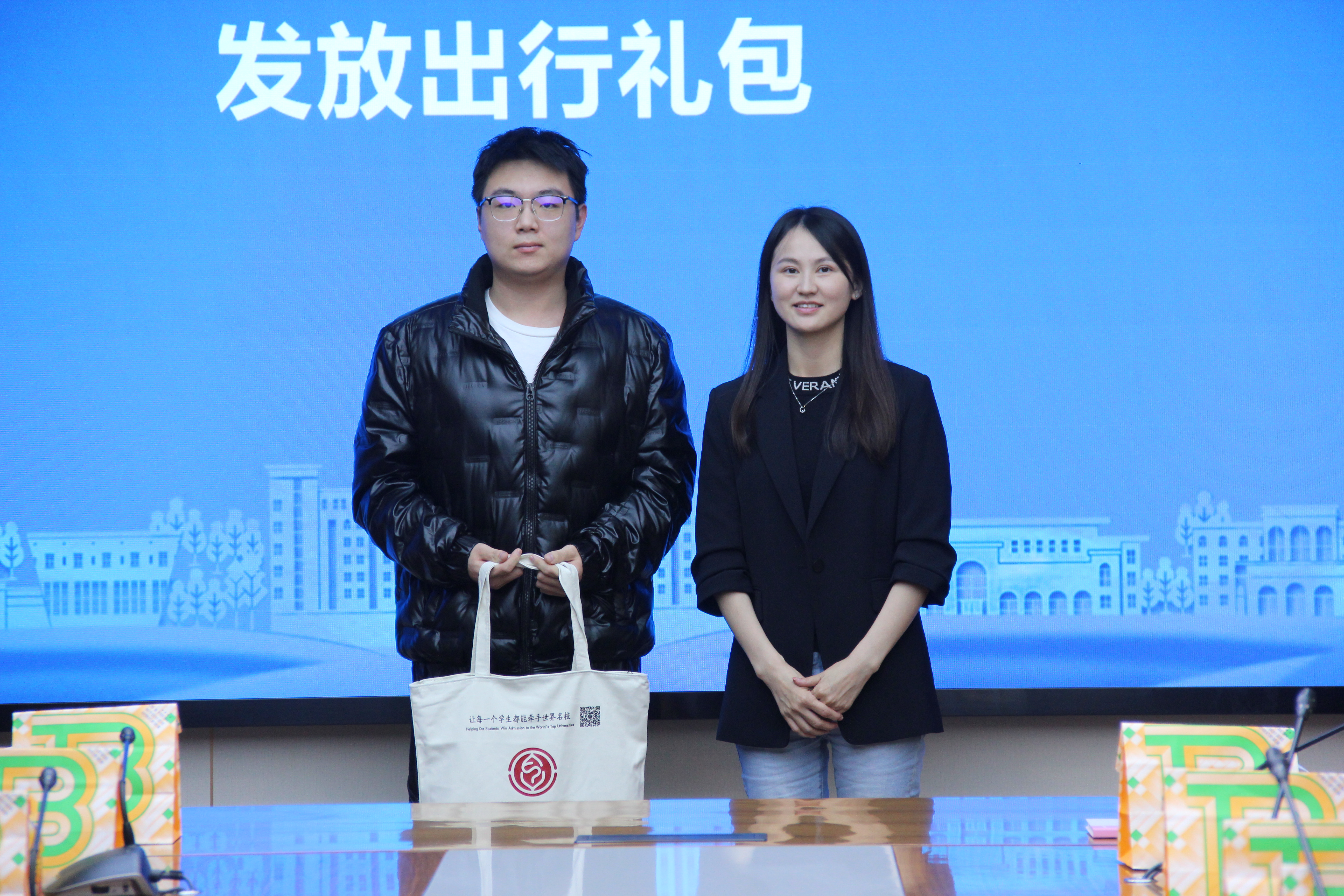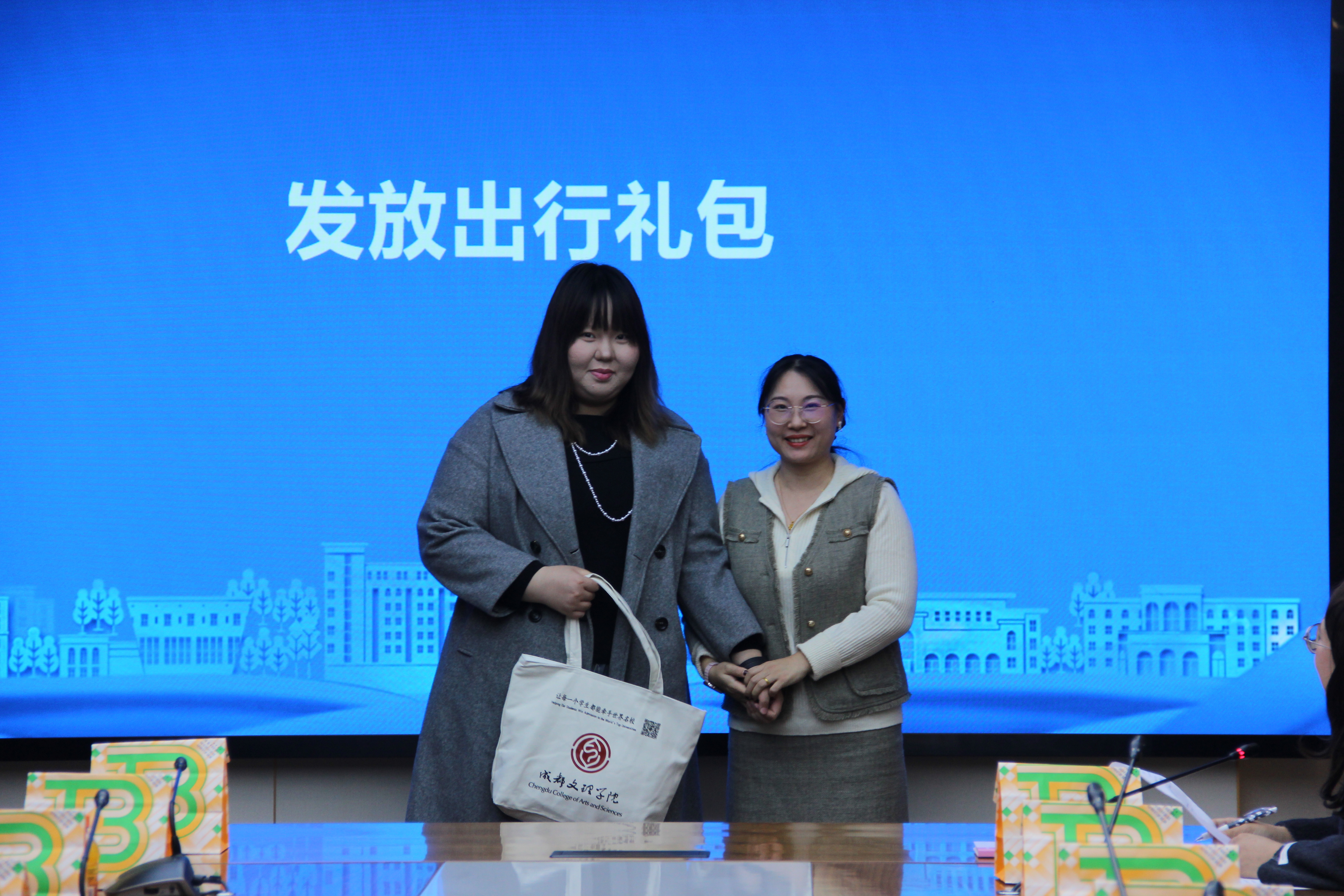 各所在学院党组织负责人、辅导员老师为出团学生发放出行礼包。