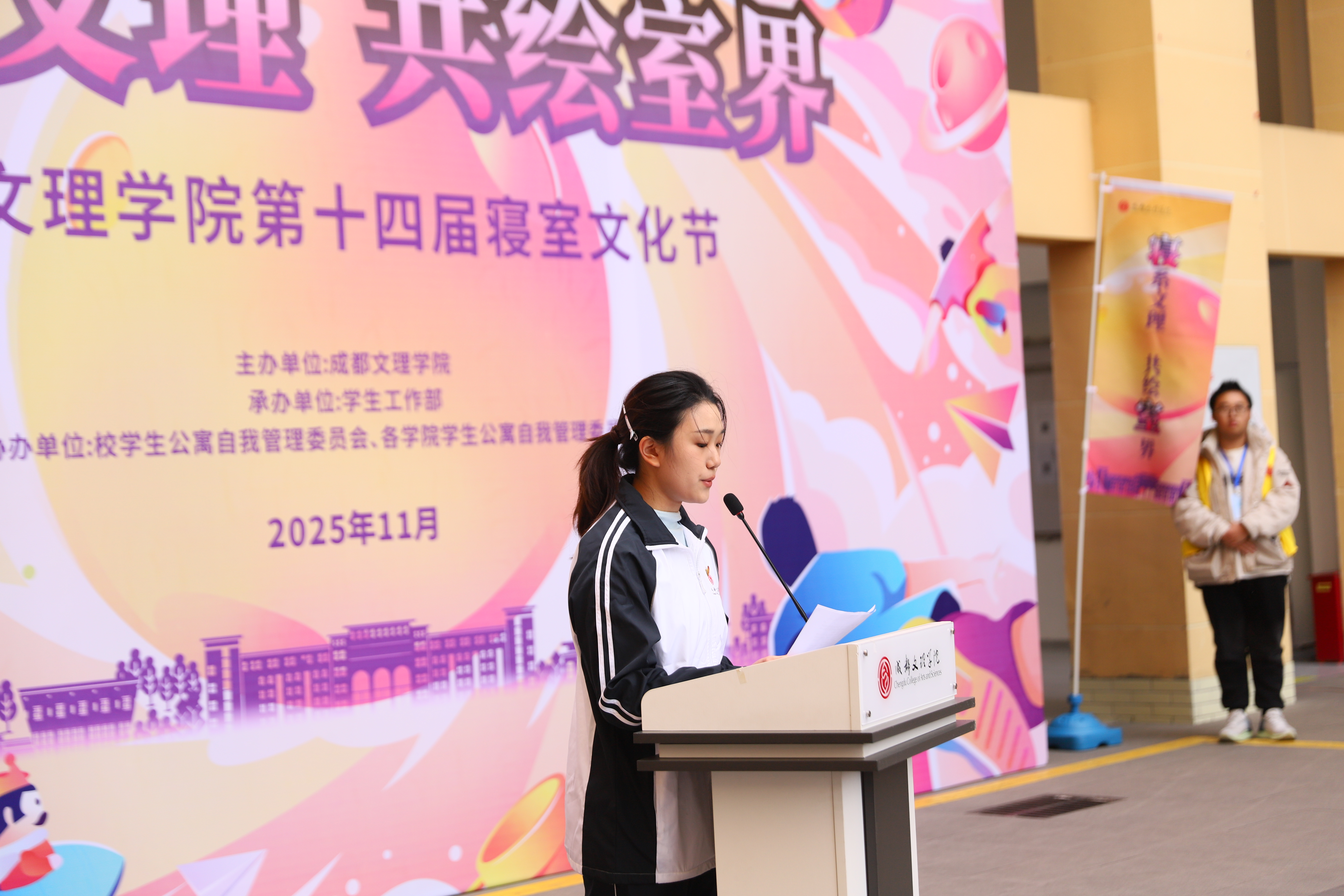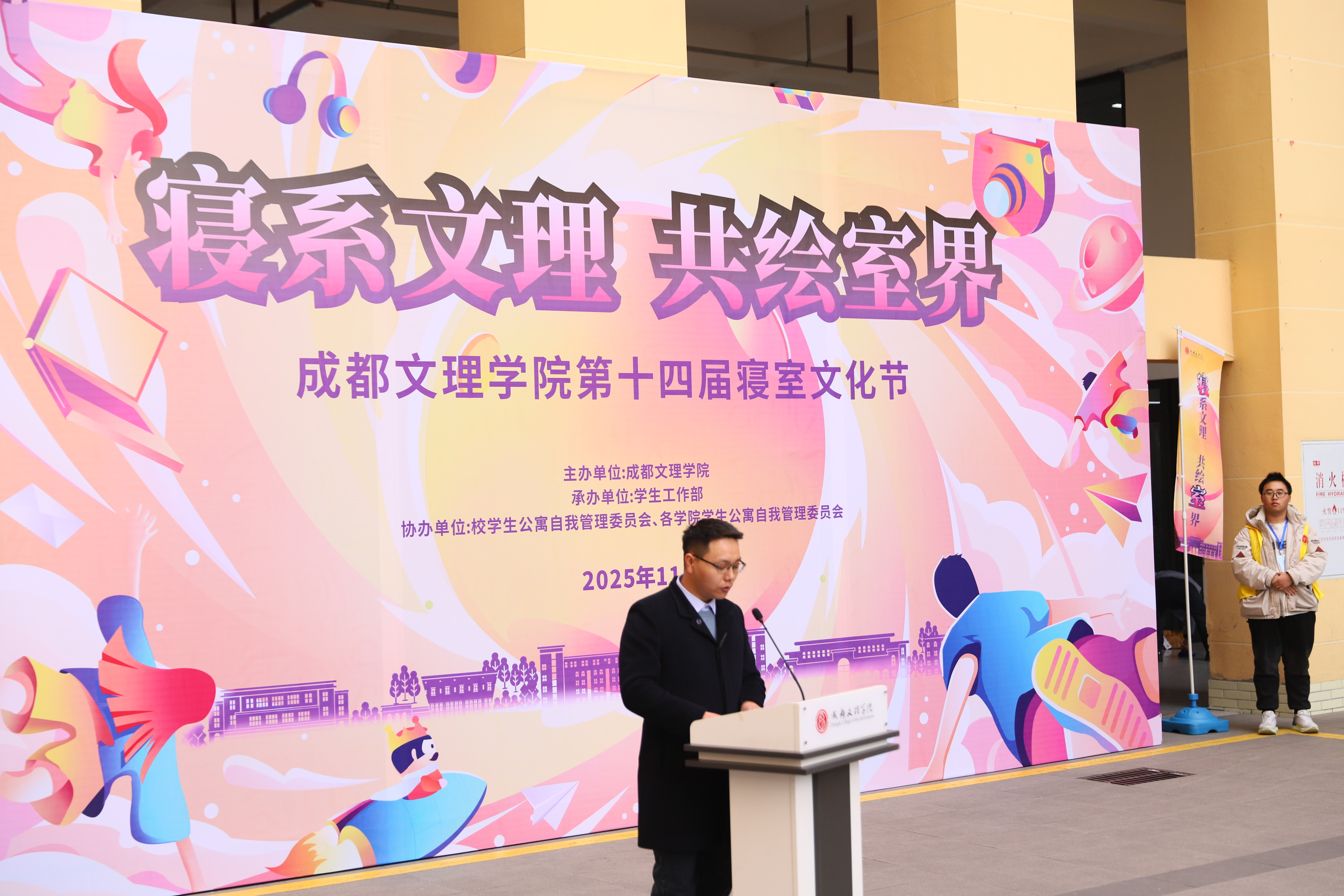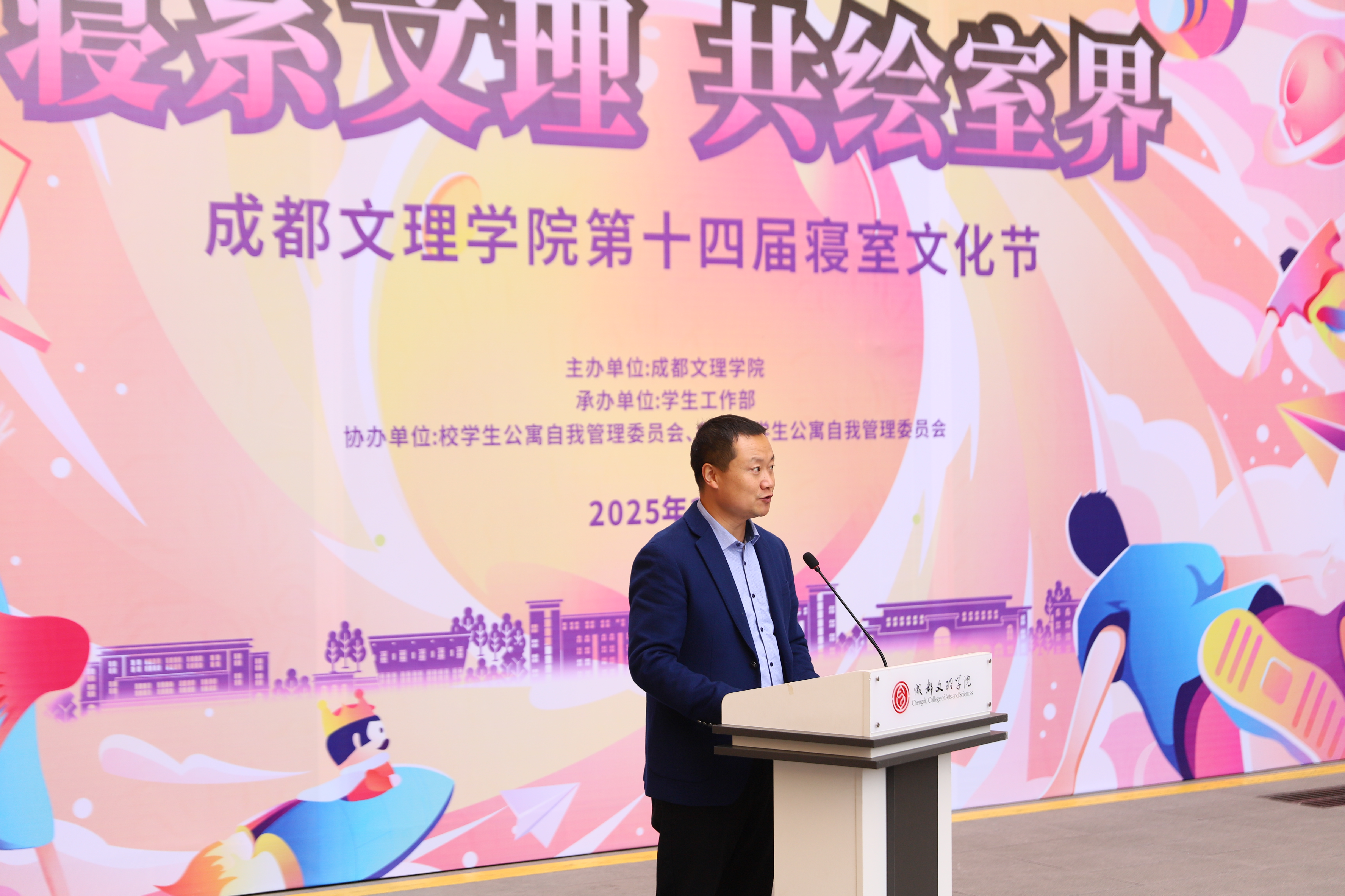 王亚军讲话。他对本届文化节的顺利举办表示热烈的祝贺。他指出,寝室是学生校园生活的重要场所,是涵养品格、培养协作精神与实践能力的关键空间。他鼓励同学们积极参与寝室文化建设,共同打造兼具文化内涵与生活温度的“青春共同体”。他就本次寝室文化节提出三点希望:希望各单位高度重视,把握寝室文化的育人功能;希望同学们积极投入,共绘寝室生活的美好画卷;希望各寝室创新争优,展现文理青年的时代风采。他表示,活动旨在通过文化浸润,营造安全整洁、温馨和谐、积极向上的寝室环境,优化学风建设,提升学生综合素养。学校希望以文化节为契机,推动寝室文化建设与学风培育、安全教育深度融合,引导文理青年展现时代风采,共同绘就青春“室”界。