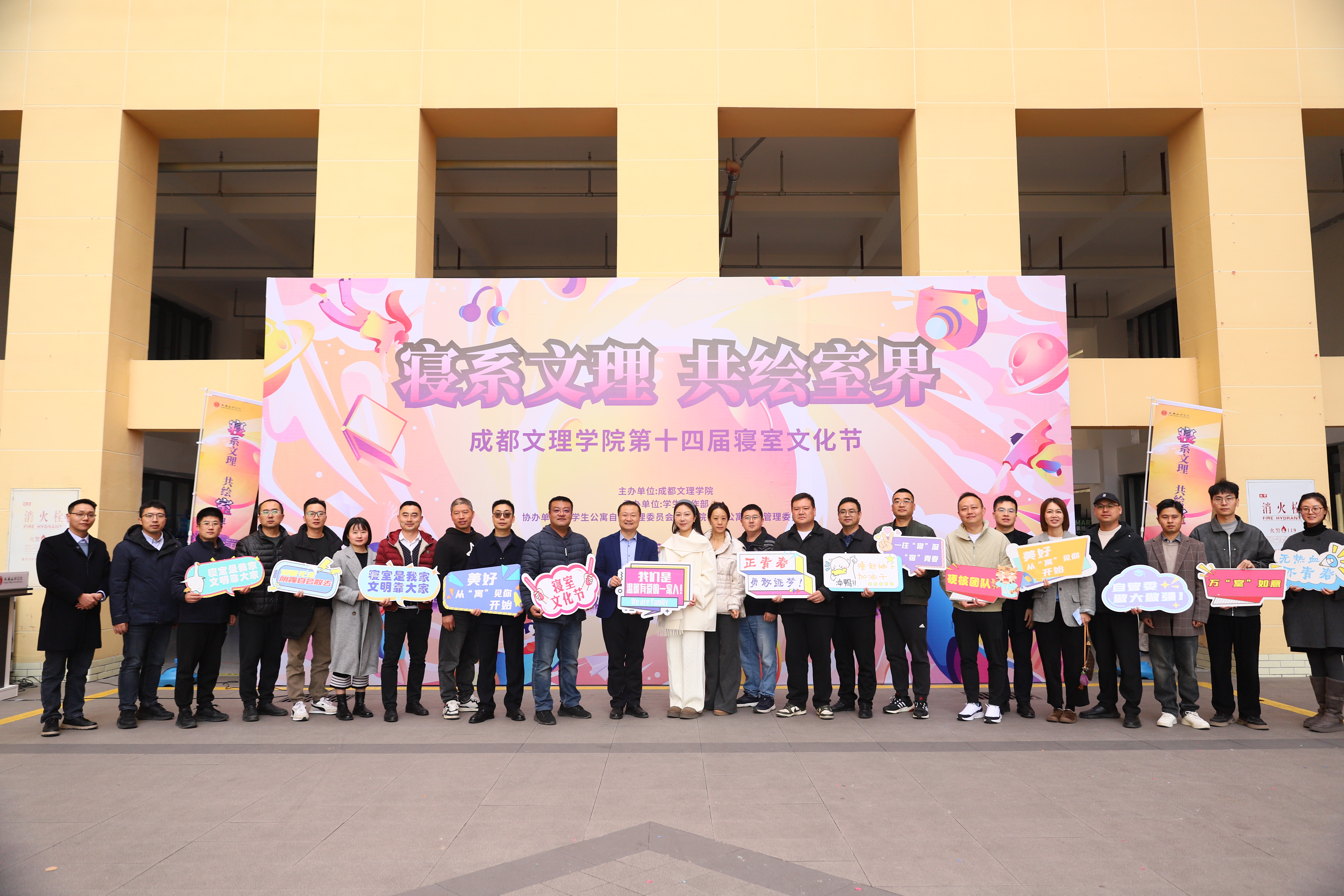 11月19日中午,我校于学生公寓23、24栋楼下广场举行第十四届寝室文化节开幕式。我校党委副书记、纪委书记王亚军出席仪式。学生工作部、校团委负责人,各学院党组织书记、副书记,学工办主任,各学院自管委分会指导教师,成都文理学院及四川应用技术职业学院校际交流师生代表,四川西南航空职业学院副校长唐昕、学生处处长陈华强、团委书记石薇及师生代表,西南交通大学希望学院学生处宿舍园区管理自治委员会指导教师张永伟及学生代表,成都银杏酒店管理学院学生工作部公寓管理与服务中心负责人李梓逍及学生代表,西南石油大学学生代表,成都大学学生代表,四川工商学院学生代表到场参加。