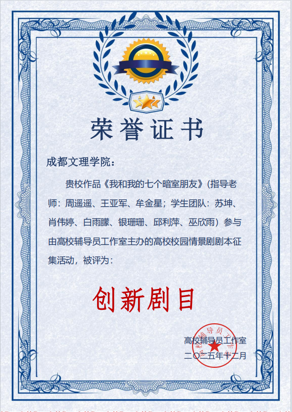本次高校校园情景剧剧本征集活动由高校辅导员工作室主办,3月份开始面向全国高校思想政治工作者公开征集,剧本要求围绕辅导员九大职责,聚焦校园生活与学生心理成长,同时需获省(区、市)级三等奖以上荣誉,吸引了多所高校的优秀作品参与。我校心理健康教育中心师生原创剧本《我和我的七个暗室朋友》以“内心自我的具象化对话”为核心创意,将大学生成长中常见的情绪困惑转化为七个暗室朋友的角色设定,生动呈现了青年群体的心理状态,通过戏剧形式传递了自我接纳的积极理念,其创新的叙事方式与细腻的情感表达获得了评审组的一致认可。该剧本荣获第三届全国高校心理情景剧剧本大赛优秀奖、学校第六届校园心理情景剧大赛三等奖。