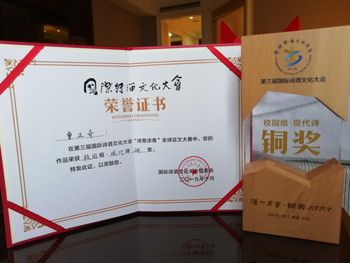10月8日,第三届国际诗酒文化大会“诗意浓香”全球征文大赛在酒城泸州举行颁奖盛典,文法学院2017级学生曹正奇的作品于此次征文中荣获校园组∙现代诗铜奖。