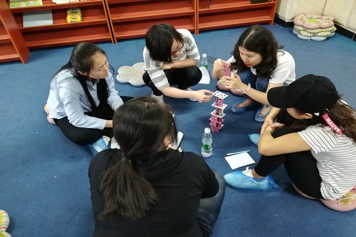 活动开始,主讲人(周俊廷)和两位助手(张敏、尹柯佳)让成员们进行了自我介绍,拉近彼此距离。随后,活动开展,第一是“乌鸦和乌龟的故事”活动;第二是“头脑风暴”活动,以一件物品为主体,进行思维发散尽可能多的写下物品的用途,然后进行分享;第三是“海草”活动,以给出的一个情景碎片为主体,发散思考构造一个完整的剧情;第四是“情景接龙”活动;收尾活动“比萨斜塔”,用仅有的18张纸牌用能想到的方法搭到最高。