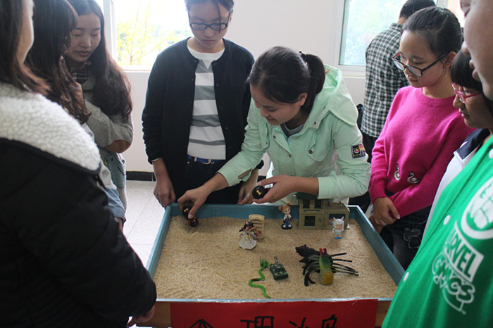 心理沙盘活动在箱庭景象中摆放的不仅仅是简单的物品,而摆放的是同学们的思考与智慧。同时,沙盘游戏也不仅仅是放松心情的游戏,它的无穷魅力和动人力量在于不需言语表达却能真正反映人的内心世界,把无形的内心世界化为有形,从而使人们获得治疗与治愈。