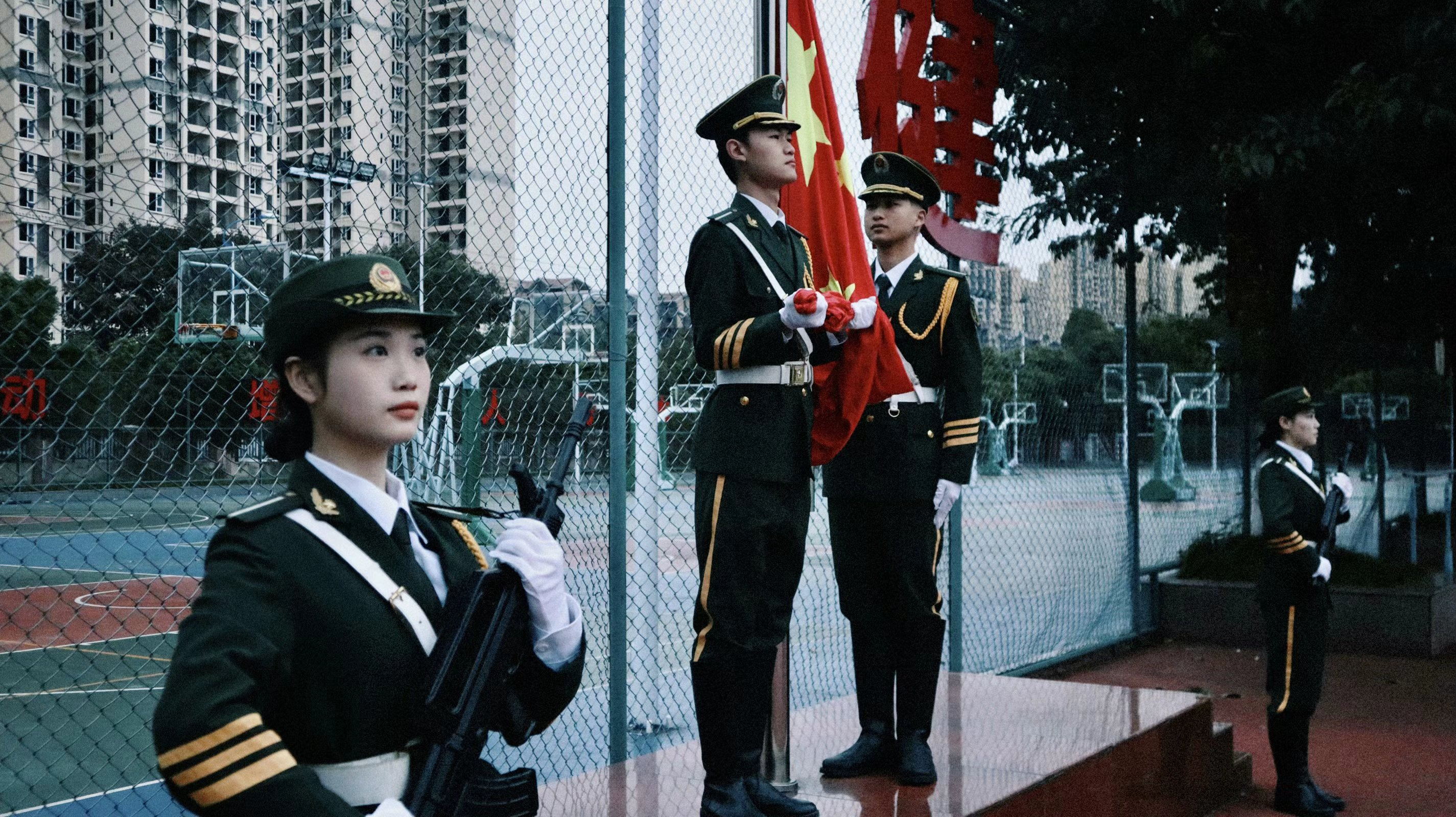 时分成都文理学院于操场举行第十周例行升旗仪式。国旗护卫队擎旗手、摇旗手及两名护旗手参与本次升旗仪式。时许升旗人员已在旗台前准备就绪严阵以待。时分升旗仪式正式开始。升国旗奏国歌。升旗手精准卡点完成抛旗动