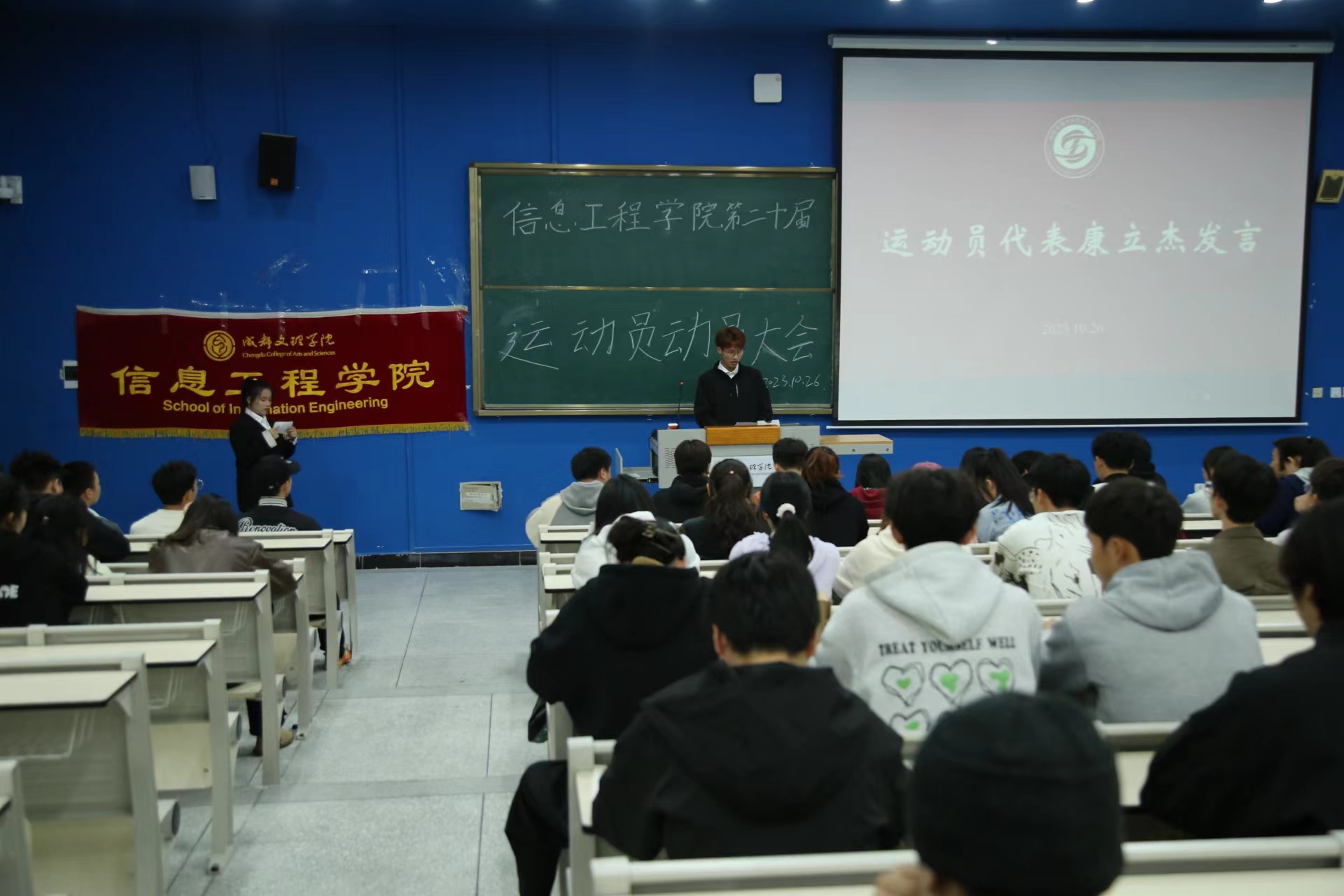 晚上信息工程学院在主教学楼栋教室举行了第二十届师生运动会动员大会。分团委书记叶青、全体部门负责人以及运动员到场参加本次大会。会议开始体育部负责人邓鹏上台发言表示运动会是一个促进交流与合作的平台更是集体