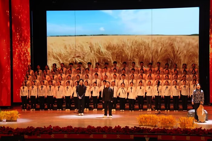 下午时分成都文理学院于星空剧院成功举行了学习新思想永远跟党走主题五四朗诵比赛出席本次活动的嘉宾有成都文理学院校领导、各学院党政领导、各部门负责人以及各学院师生代表。活动伊始全体起立奏唱国歌随后党委书记