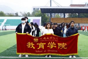 时分成都文理学院于第一运动场举行第六周例行升旗仪式。教育学院、马克思主义学院领导级学生及国旗护卫队队员参与本次升旗仪式。时许全体师生和国旗护卫队员们在旗台前集合完毕等待升旗。时分升旗仪式正式开始。全体