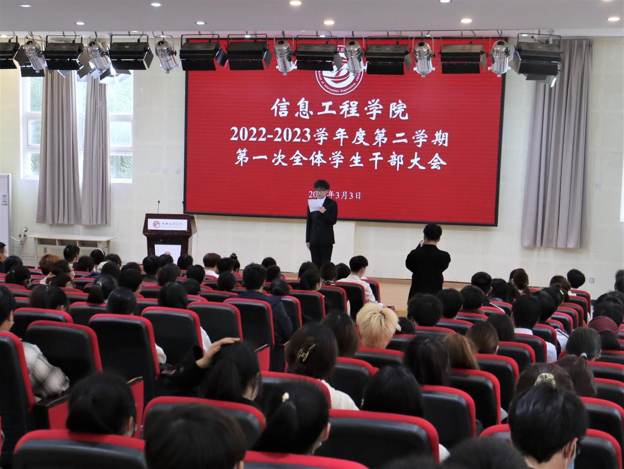 上午信息工程学院于学工部楼会议室召开信息工程学院学年度第二学期第一次全体学生干部大会。学生工作办公室主任尹隆龙、分团委书记叶青、学生公寓自我管理委员会信息工程学院分会指导老师林欣滢、分团委社团管理部指