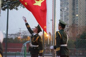时分成都文理学院于操场举行第二周例行升旗仪式。国旗护卫队全体队员参与本次升旗仪式。时许国旗护卫队队员在旗台前集合完毕等待升旗。时分升旗仪式正式开始。升旗队列精神饱满昂首阔步地护送国旗走向升旗台。在激昂