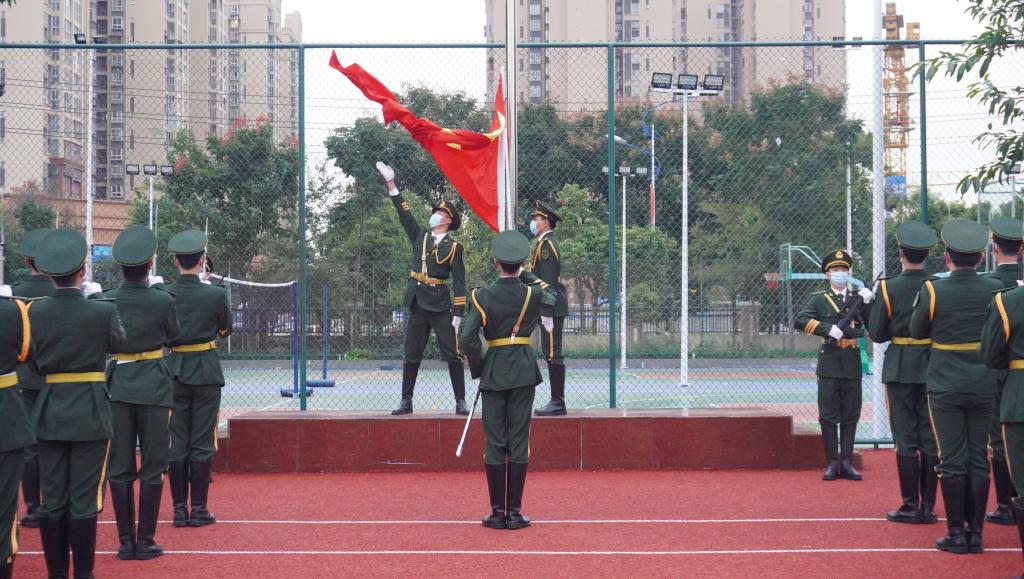 时分成都文理学院于操场举行第七周例行升旗仪式。国旗护卫队全体队员参与本次升旗仪式。时国旗护卫队队员在旗台前集合完毕等待升旗。时分升旗仪式正式开始。昂首阔步英姿飒爽升旗队员迈着铿锵有力的步伐国旗护送至旗