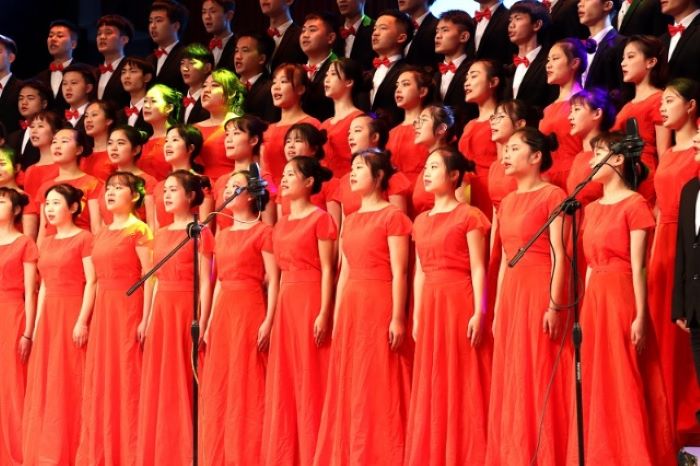 我校以壮丽七十周年奋斗新时代为主题庆祝中华人民共和国建国七十周年暨纪念一二九学生抗日救亡运动周年师生歌咏活动校级汇演于星空剧场举行。艺术学院以一曲向往获得比赛三等奖及优秀组织奖。活动伊始全体起立奏唱国