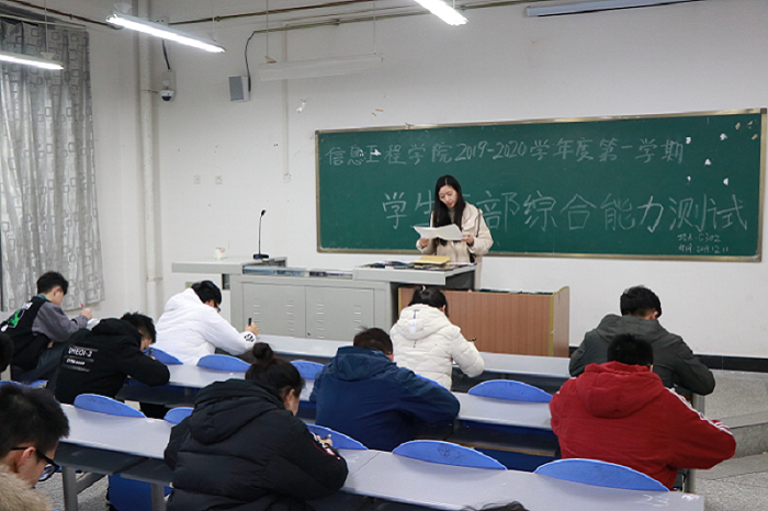 时许信息工程学院在主教学楼栋、、、教室组织至学年度第一学期学生干部期末综合测试。本次测试由信息工程学院分团委书记曾宇辅导员老师韩晶晶、叶青监考各学生机构学生干部参考。学生干部提前进入考场按秩序签到就坐