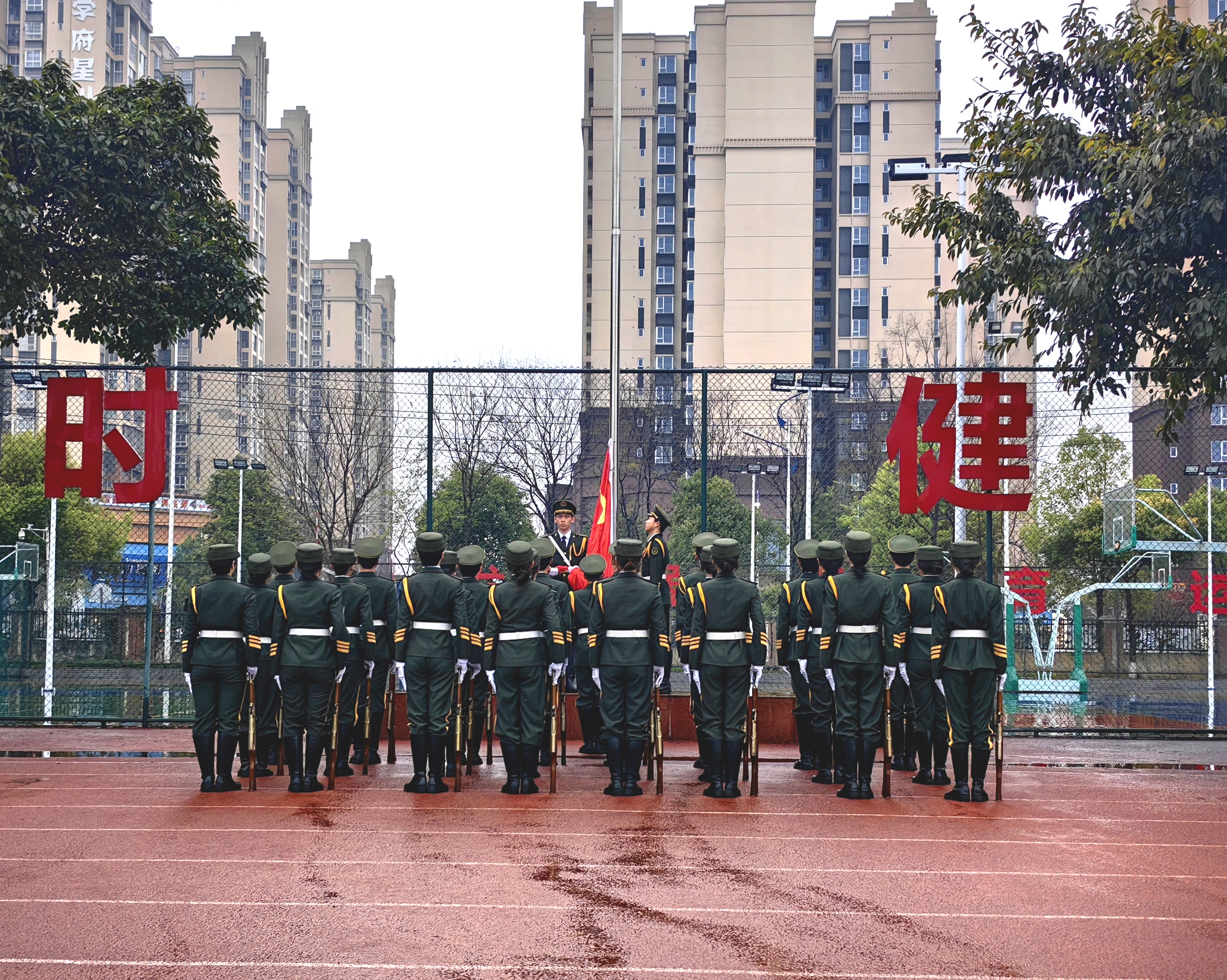 7时许,全体师生和国旗护卫队队员们在操场集合完毕,等待升旗。7时20分,升旗仪式正式开始。枪挑千钧势,步震九霄云。升旗队列队员们如青松挺立,似翠柏盎然;步伐铿锵,足音震彻云霄。“劈枪”一声令下,钢枪瞬间出鞘,动作整齐,枪尖所指,锋芒毕露。当雄壮的国歌划破雨幕,鲜艳的五星红旗迎着风雨冉冉升起。至此,升旗仪式结束,全体师生有序离场。