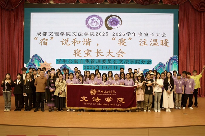 为推进文明寝室建设,营造和谐融洽的寝室氛围,文法学院10月15日15时40分在文理讲堂召开“‘宿’说和谐,‘寝’注温暖”寝室长大会。文法学院党委副书记兼学工办主任李明昌,自管委指导老师黄海霞、吴艳及各位辅导员,2025级寝室长和生活心理委员们参与此次大会。