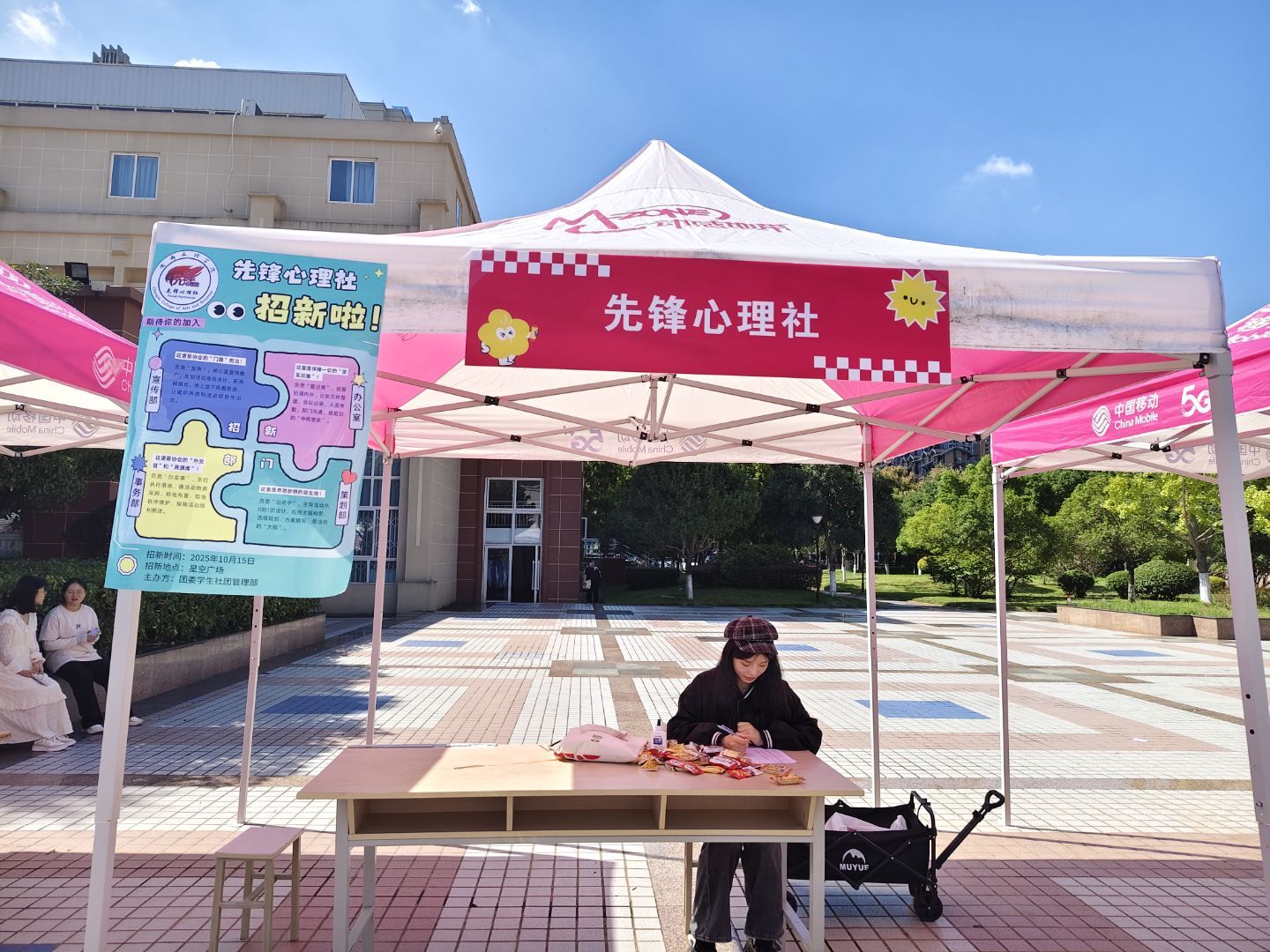 10月15日上午9时,先锋心理社在星空剧场B16点位开展以“先锋邀你心,与心赴新约”为主题的社团招新活动。