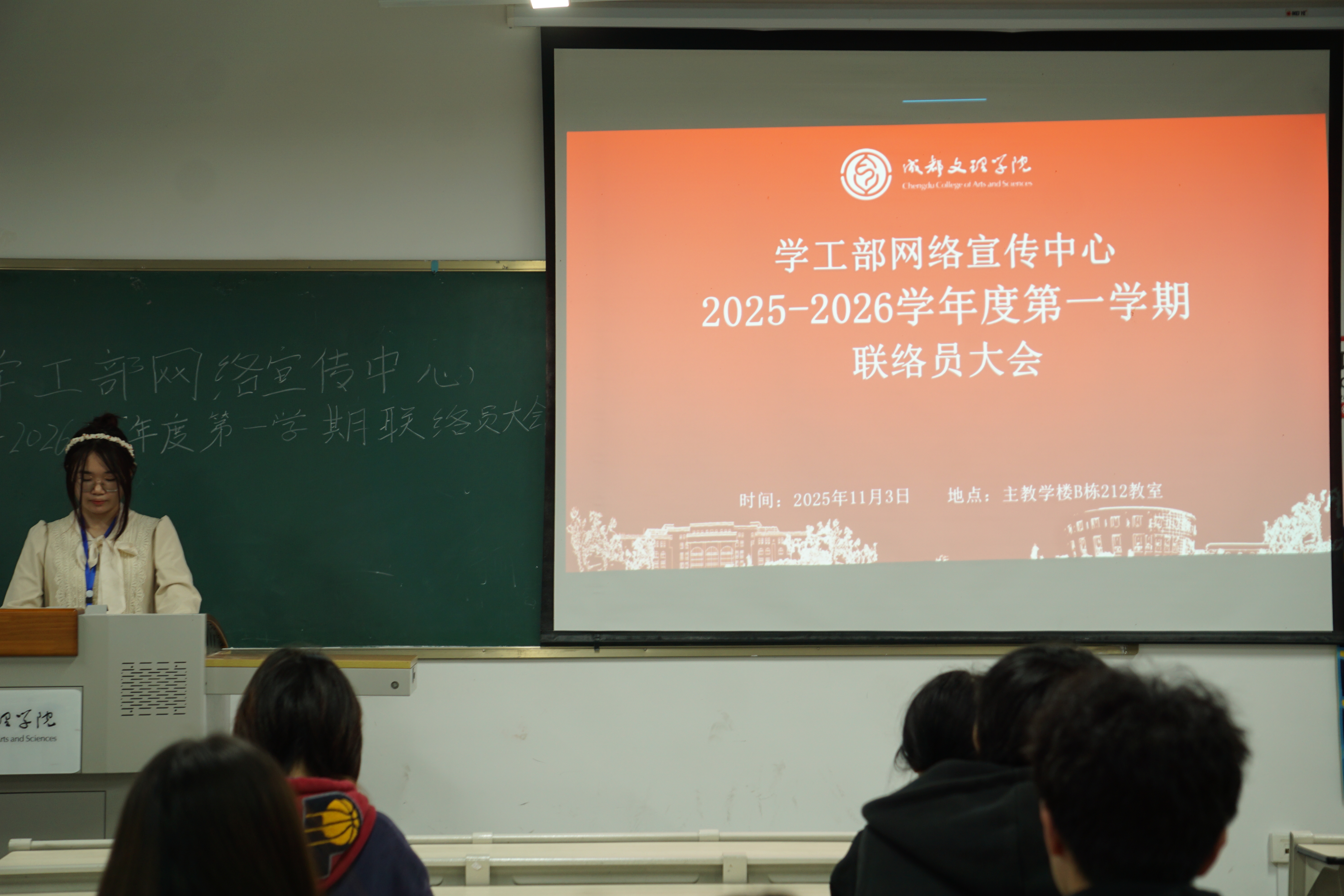 11月3日20时30分,学工部网络宣传中心于主教学楼B栋212教室召开2025-2026学年度第一学期联络员大会。各二级学院及学工部学生机构联络负责人到场参加,本次会议由学工部网络宣传中心新闻部部长李晓蒂主持。