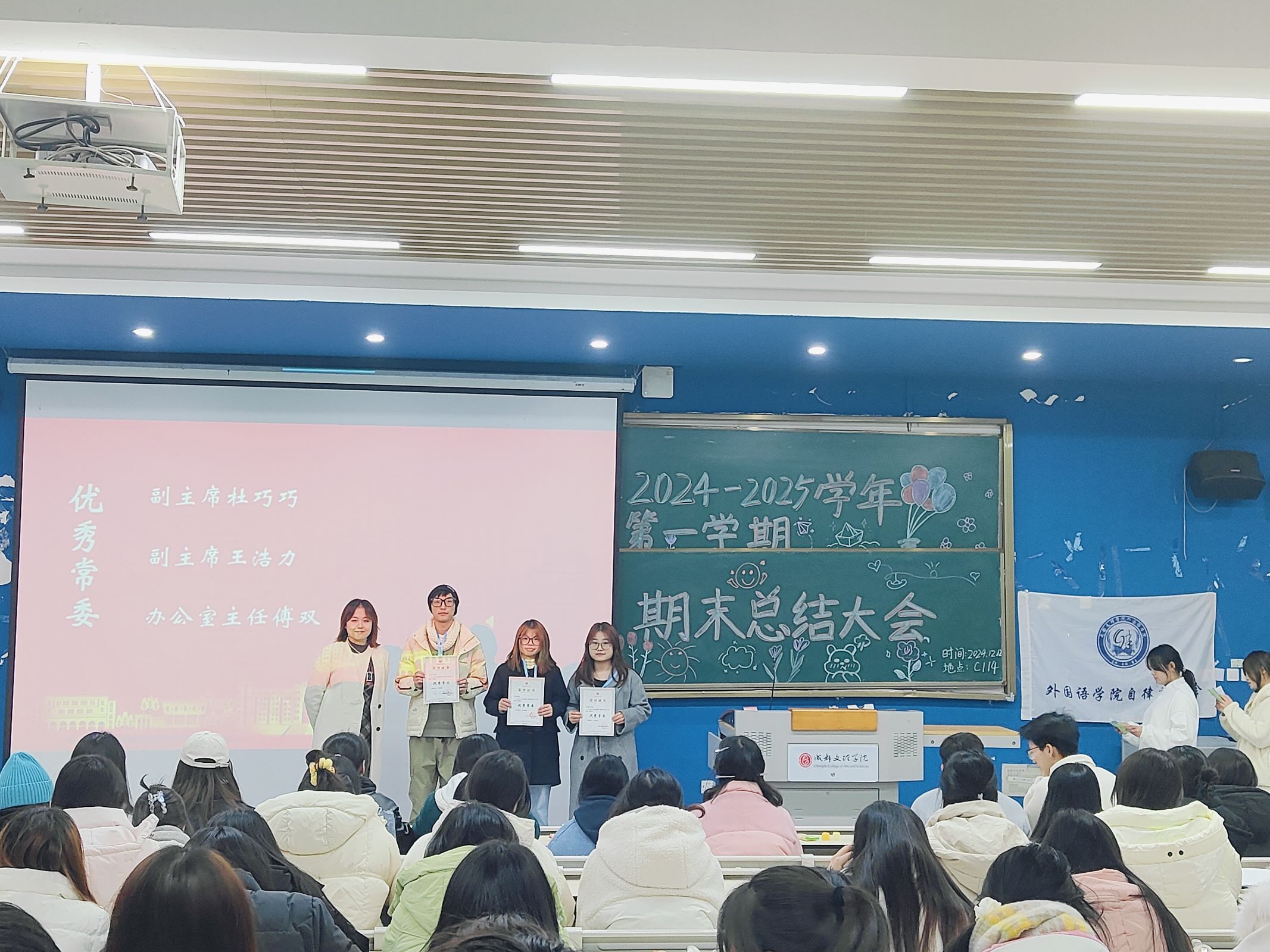 12月12日17时30分,外国语学院自律委员会于主教学楼C栋114教室举行期末总结大会,指导老师曾雪雁到场参会。