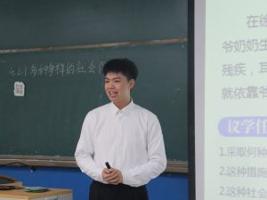 古威讲话。他肯定参赛选手的良好表现。他针对选手们在教学设计和时间把控等方面提出建议,强调作为一名师范生需要具备扎实的专业知识和创新思维能力,创新课堂教学设计,提高自身应变能力,提高课堂教学效率。最后,他鼓励同学们多关注时政新闻,积累时政案例,拓宽知识视野。