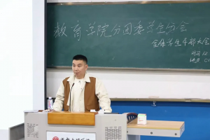 大会第二项议程,教育学院分团委书记毛玮老师致辞。他向所有学生干部致以真挚的感谢,并分享了几点宝贵的建议。毛玮老师期望学生干部们要勇担重任,积极参与到学校的各项工作中,为学校的长远发展和同学们的全面成长贡献智慧与力量。他特别强调,学生干部应当严格自律,不断提升个人的综合素养,树立正确的世界观、人生观和价值观。此外,他还鼓励学生干部们在实践中成为表率,积极引导同学们投身于各类有益身心发展的活动之中。