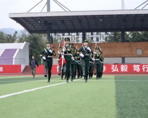 7时整,升旗队列在主席台前集合完毕,其余队员于旗台两侧军姿立定,等待升旗。7时20分,升旗仪式正式开始。升旗队列精神饱满,昂首阔步前进,护送国旗走向升旗台。庄严的国歌声响起,擎旗手振臂扬旗,全体师生凝神伫立,高声齐唱国歌。在激昂的国歌声中,五星红旗缓缓升至文理上空,迎风飘扬。