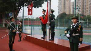 7时,升旗队列在主席台前集合完毕,其余队员于旗台两侧军姿立定,等待升旗。7时20分,升旗仪式正式开始。响亮的一声“端枪”后,升旗队列队员们个个英姿飒爽、昂首挺胸,踏着铿锵有力的步伐,护送五星红旗行进至旗台前。升国旗,奏唱国歌,鲜艳的五星红旗在空中徐徐升起,迎风飘扬。至此,升旗仪式结束,全体人员有序离场。