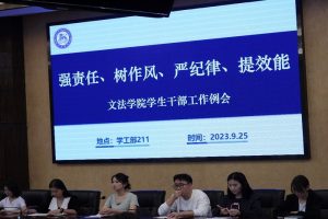 为了发挥学生干部的先锋模范作用,引导学生干部牢固树立服务意识,9月25日下午17时,文法学院在学工部楼211会议室组织召开了学生干部工作例会。文法学院分团委书记王晨静、各部门指导老师及全体学生干部出席。本次会议以“强责任、树作风、严纪律、提效能”四大方针为要领,旨在打通各部门学生干部之间存在的堵点、难点。