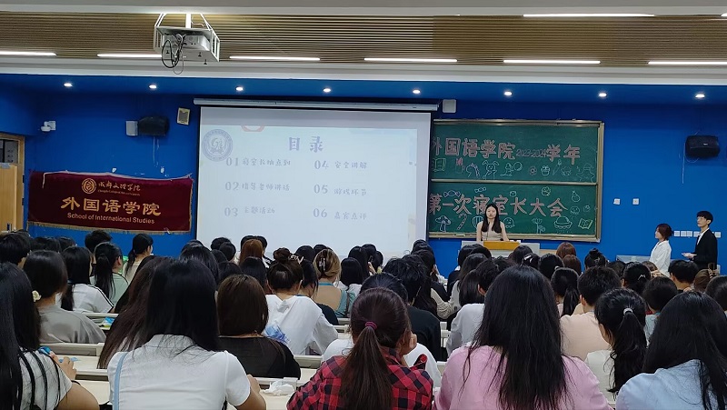 为营造文明和谐,安全舒适的寝室环境,加强寝室建设,提高学生个人素养。外国语学院自律委员会于9月13日晚上20时30分在主教学楼C栋114教室举行2023-2024学年第一学期第一次寝室长大会。出席会议的嘉宾有外国语学院资助负责人杨云老师、自律委员会指导老师王小琴、自律委员会主席王维、副主席李艳君、粟楚惠、自律委员会办公室主任马银消、外国语学院自律委员会全体成员及外国语学院各年级寝室长。