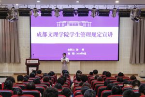 孙婷针对学生管理规定展开宣讲,主要包含学生“奖、贷、助、勤、补、免”等政策解读、学生日常行为规范、学生寝室管理、奖学金及荣誉称号评定、违纪处理等方面。她还结合《成都文理学院学生手册》,教育2023级新生要树立正确的价值观念,不断强化自身的校规校纪意识和自警自律意识,有效提高自我教育、自我管理、自我服务、自我监督的能力,做守公德、严私德、知敬畏、懂规矩的新时代大学生。