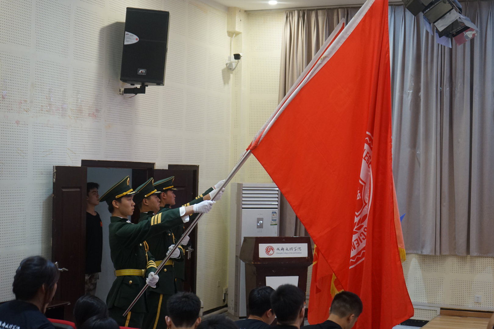 会议伊始,在场人员保持肃立,迎国旗,奏唱国歌。礼毕后,开始播放视频,该视频简单回顾国护的训练时光,展现出队员们饱满的精神风貌。随后,队长董硕发言。他从日常训练、各项任务活动、各部门工作三个方面进行总结,对全体队员的付出给予肯定和鼓励,感谢大家的辛苦和坚持。同时也指出队员队列动作、思想等方面存在的问题,需加强训练和端正思想态度。紧接着,董硕以视频形式带大家重温国护历程,希望大家牢记初心,勇往直前,在自己的领域继续发光发热。