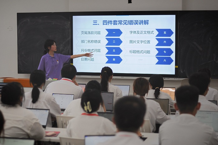 会议伊始,学生代表对参会人员进行点到,接着介绍了此次培训的基本流程。首先,学生干部代表对学生工作中的三四件套常见错误进行讲解,重点强调了院内总结的格式以及三四件套的字体、正文格式、日期、尾页落款等问题。其次,文法学院秘书处干事讲解了三四件套制作流程,分别从月计划与月总结两个方面来具体阐述,对其内容、结尾和格式进行了要求与规范。最后,学生干部之间进行了交流,大家针对具体问题提出了实际操作的办法,并就工作中的疑惑及困难进行了讨论。参培学员全程认真做好培训记录,以严谨的态度对待此次培训。