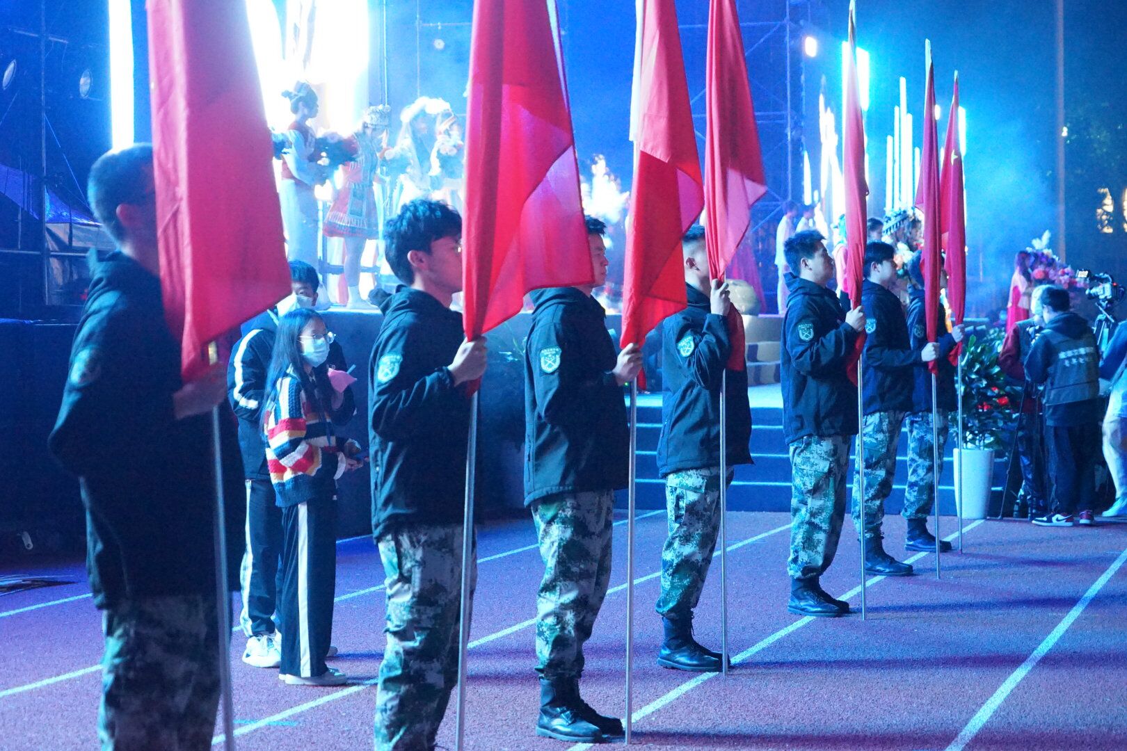 11月23日19时,以“学习二十大,奋进新征程”为主题的第19届科技文化博览节开幕式暨2022年迎新晚会在第一运动场隆重举行。国旗护卫队此次参演《领航》和歌曲《歌唱祖国》两个节目,共20人参与,国旗1人,党旗1人,红旗18人。
