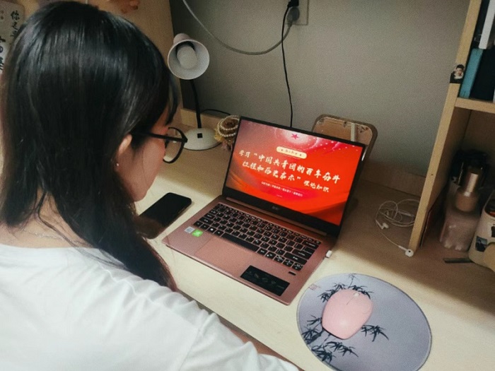 会议伊始,大家共同观看“峥嵘百年史,砥砺少年行”宣传片。视频中强调了我们要“以史为镜”,深刻理解中国共产党成立和发展的光辉历史。教育学院分团委办公室主任张鑫带领学生干部共同学习“中国共青团的百年奋斗征程和历史启示”,并指出一直以来共青团始终跟随党的脚步,走过了一条不平凡的奋斗之路。我们应牢记党的教诲,立志民族复兴,不负韶华,不负时代,不负人民,担当时代之责。学生干部付秋月、欧阳纬恒以团员青年的视角进行自我事迹分享,表示在新征程下应深入贯彻新发展理念,永不停歇奋斗的脚步,将个人梦与中国梦相结合,在改革开放中创造出新天地。活动最后,全体人员重温入团誓词。