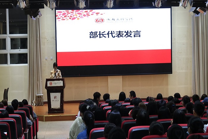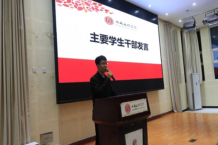 首先由部长代表体育部部长凌心悦发言,她对新干事们的到来表示欢迎,表达了自己的期望,希望大家能成为更优秀的自己;优秀学生干部钟鸿宇、彭湘、罗婧芸、杨桓、彭茨代表依次发言,总结本次招新活动,给予肯定的同时也指出活动中存在的不足,也表达了对新干事的期待,希望新干事们不忘初心,砥砺前进;体育部干事袁宇翔作为干事代表发言,表达了自己加入学生会的想法和对未来的规划与期待;张敏老师、王晨静老师分别表达了自己对新干事的期望,希望新干事们在接下来的活动中,能够从性格、能力等方面得到锻炼,有自己的成长与收获,努力变成自己想要的模样;最后是分团委书记侯刚老师发言,他指出学习的重要性,希望大家在学习、工作、生活中能够相互兼顾,向优秀学长学姐学习,并做好自己学生干部的模范作用,为同学服务,希望大家肯干,肯做,敢言,能积极提出自己的想法和见解,众人拾柴火焰高。