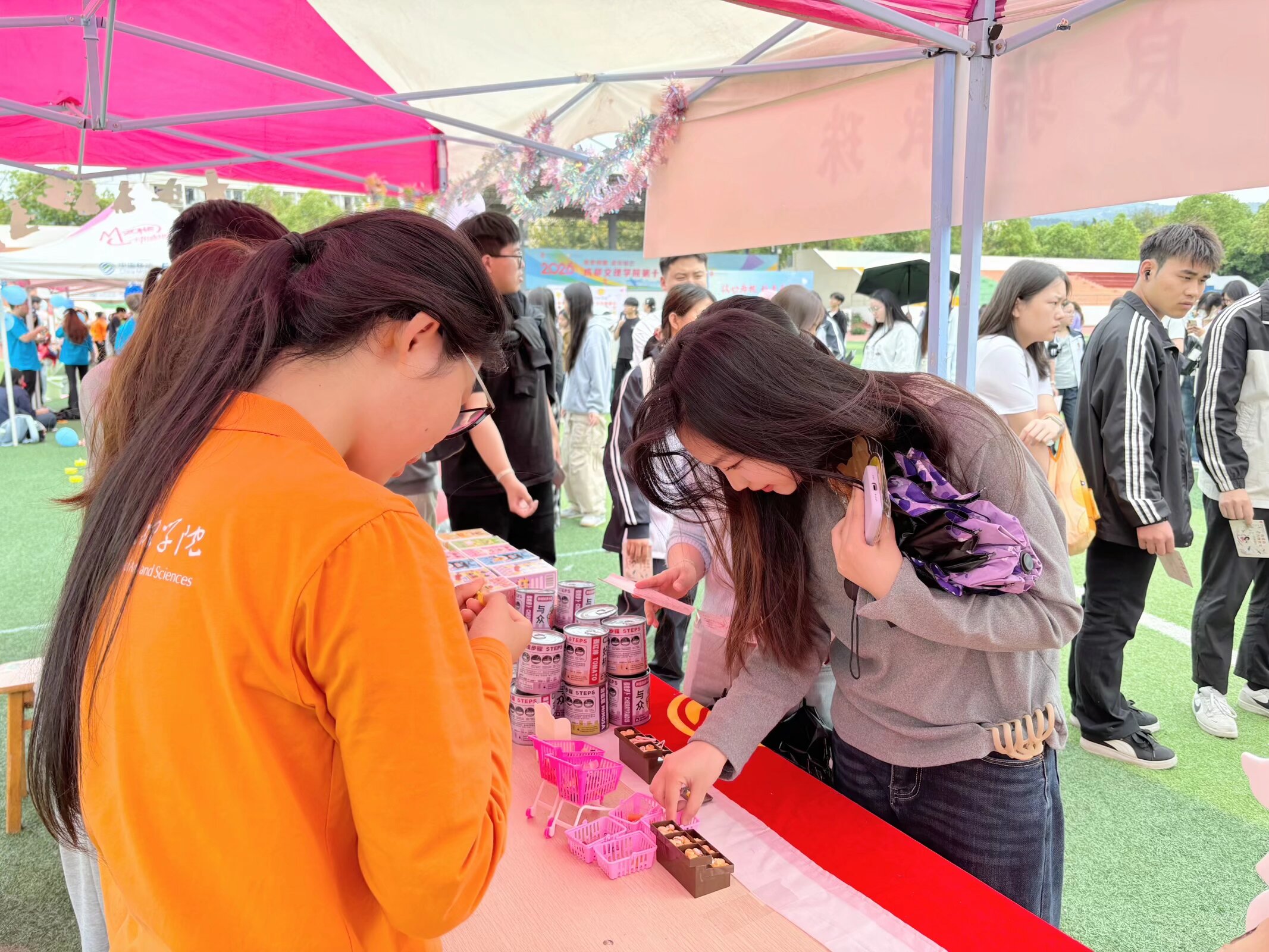 活动现场,游戏“良驹承珠”吸引了众多同学踊跃参与。游戏以投掷互动为形式,参与者在指定线外将乒乓球投向目标框,根据投中次数获得对应奖励。规则简单易懂,既考验专注力,又充满互动趣味,大家在一次次尝试中收获挑战的乐趣,也在同伴的加油鼓劲中拉近距离,不知不觉间卸下了学业压力,现场氛围轻松热烈。