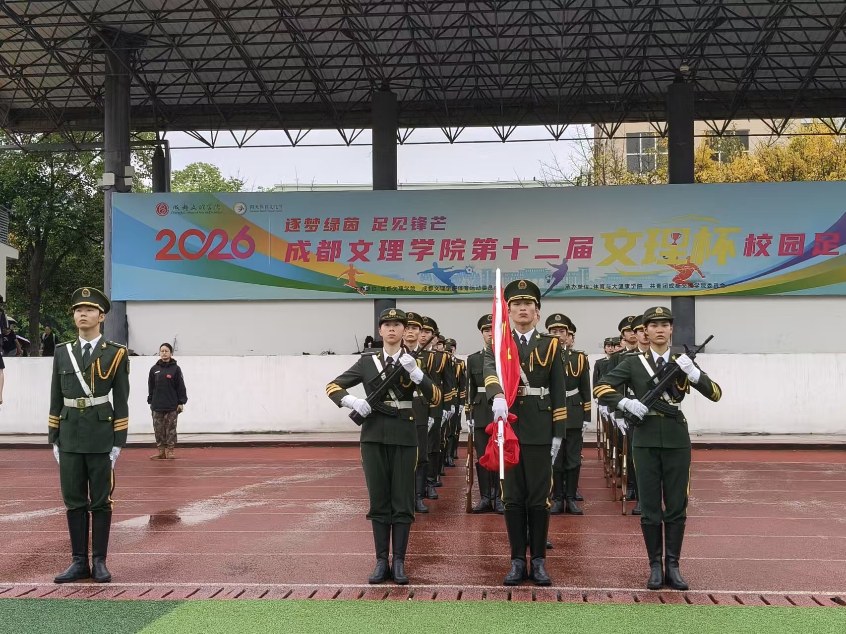 4月27日7时20分,成都文理学院于第一运动场举行第九周例行升旗仪式暨纪念五四运动107周年升旗仪式。数智经济与管理学院、会计学院领导、全体辅导员、2025级学生以及国旗护卫队全体队员参与本次升旗仪式。